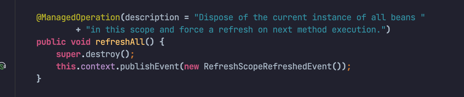也就是说,只要我们调用ContextRefresher#refresh方法, 就可以置空所有refresh作用域的bean。
